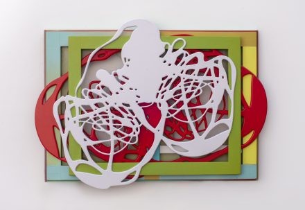 Suspensión que se mece y baila nº 2, 2013. Acrílico sobre madera y pvc, 125 x 114 x 10 cm.